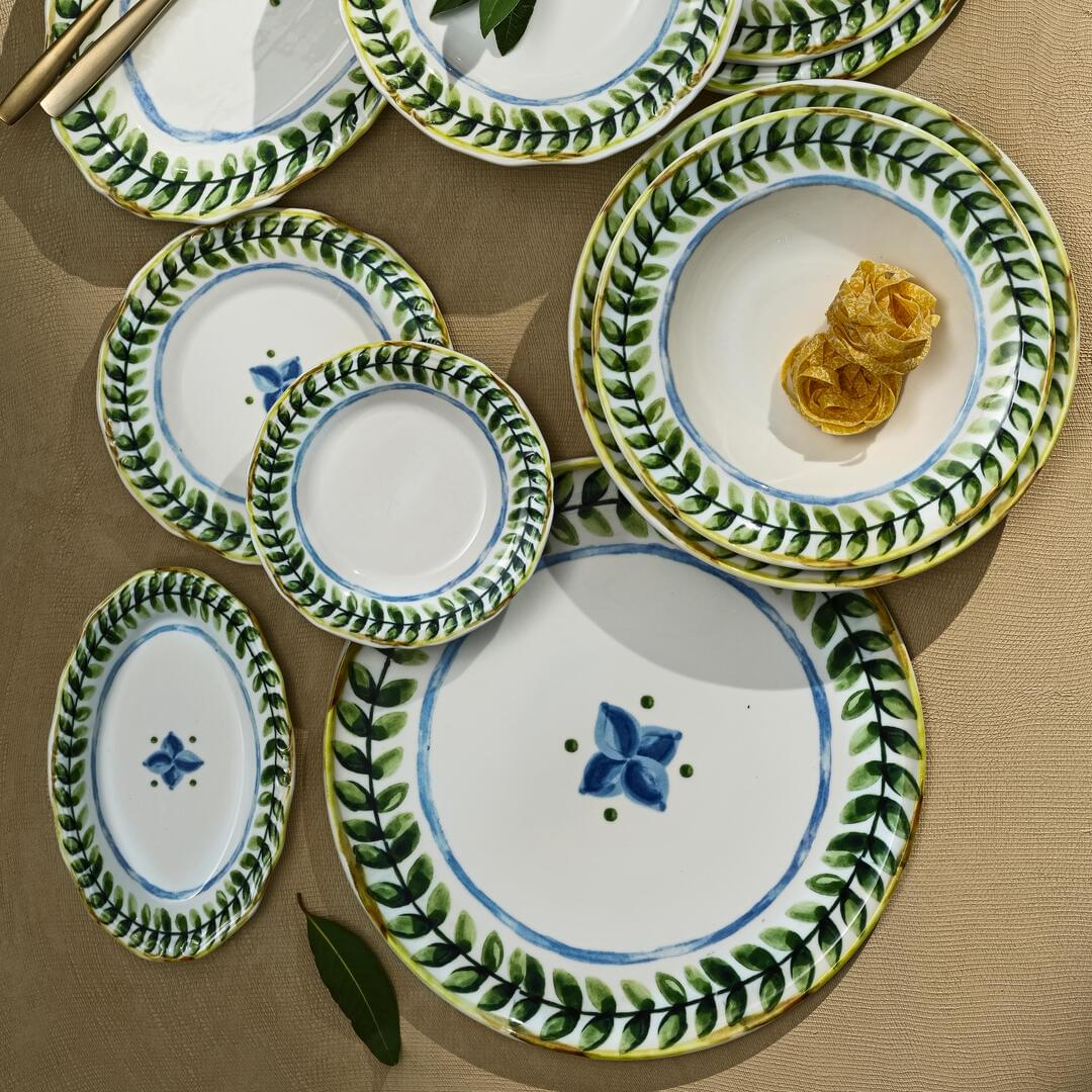 Bring the vibes of summer on the Amalfi coast to the dining room with the Capri range by ID Fine. Drawing on traditional handpainted ceramics, each piece is bordered with a bold leaf design and a rich palette of Mediterranean blues and greens, digitally applied for crisp detailing and subtle surface texture. The centre of select pieces is playfully embellished with a vibrant blue flower motif, whilst other pieces remain a fresh white porcelain canvas, allowing food to shine.