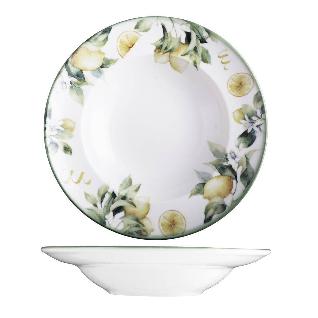 Transport your guests to the shores of southern Italy with the Sorrento range by ID Fine. Inspired by coastal citrus groves for a fully immersive presentation, each piece is framed by a delicate border of lemon trees, expertly applied using innovative digital printing for crisp detail and a subtly textured surface. The centre of each piece remains a crisp white porcelain canvas, drawing the eye to the centre of each piece and immersing diners into the heart of the mediterranean.