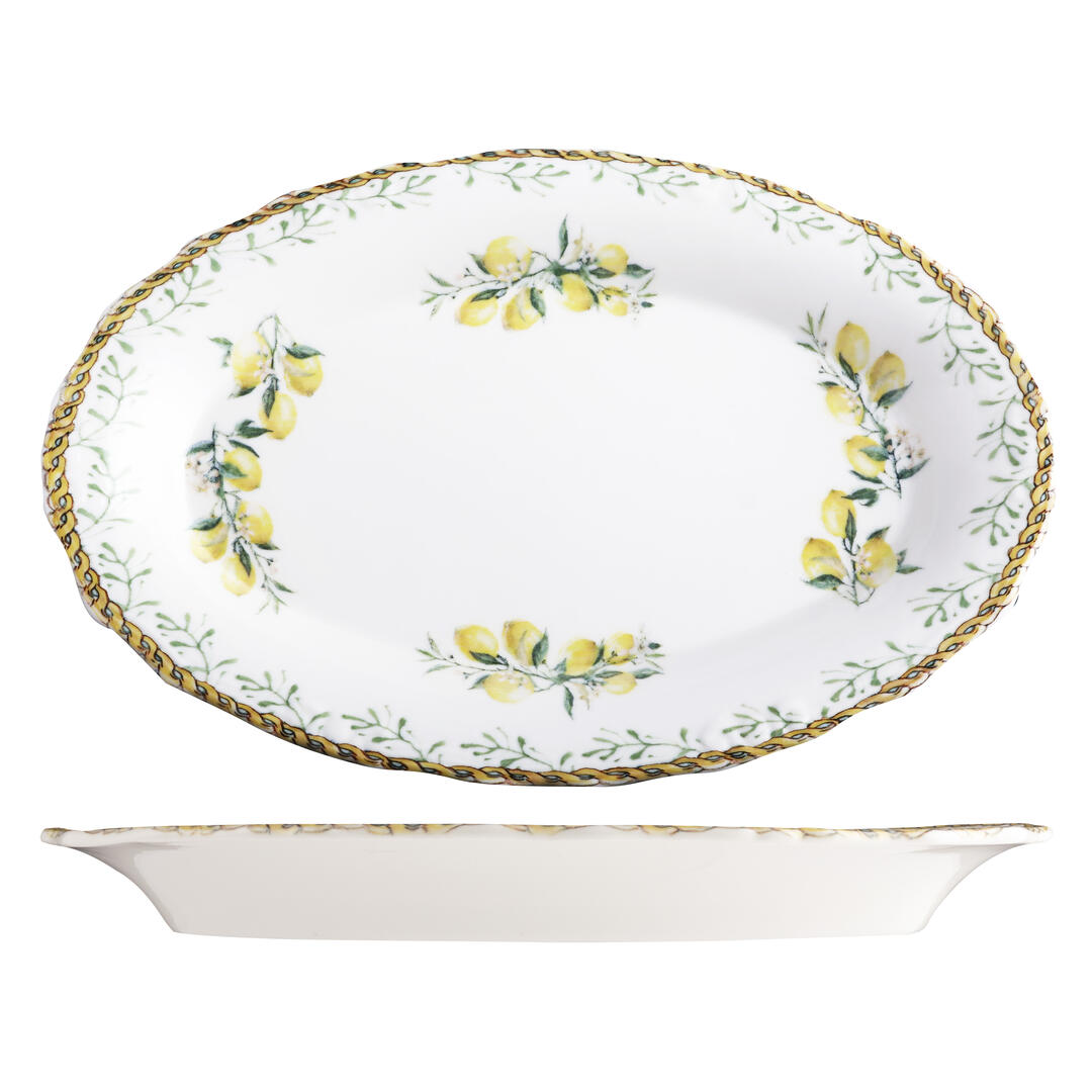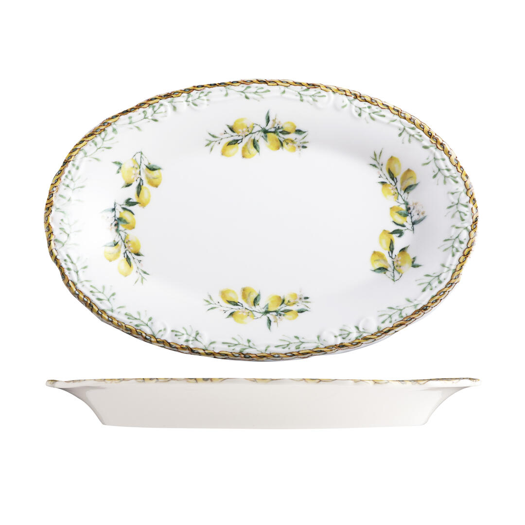 Capture the romance of northern Italy with the Verona range by ID Fine. A floral border of lemon blossoms and delicate foliage wraps around each piece, accented with soft botanical illustrations and applied using state-of-the-art digital printing to achieve layered depth and textural contrast. At the centre, a clean white porcelain base keeps presentation focused and refined — ideal for fresh, seasonal fare.