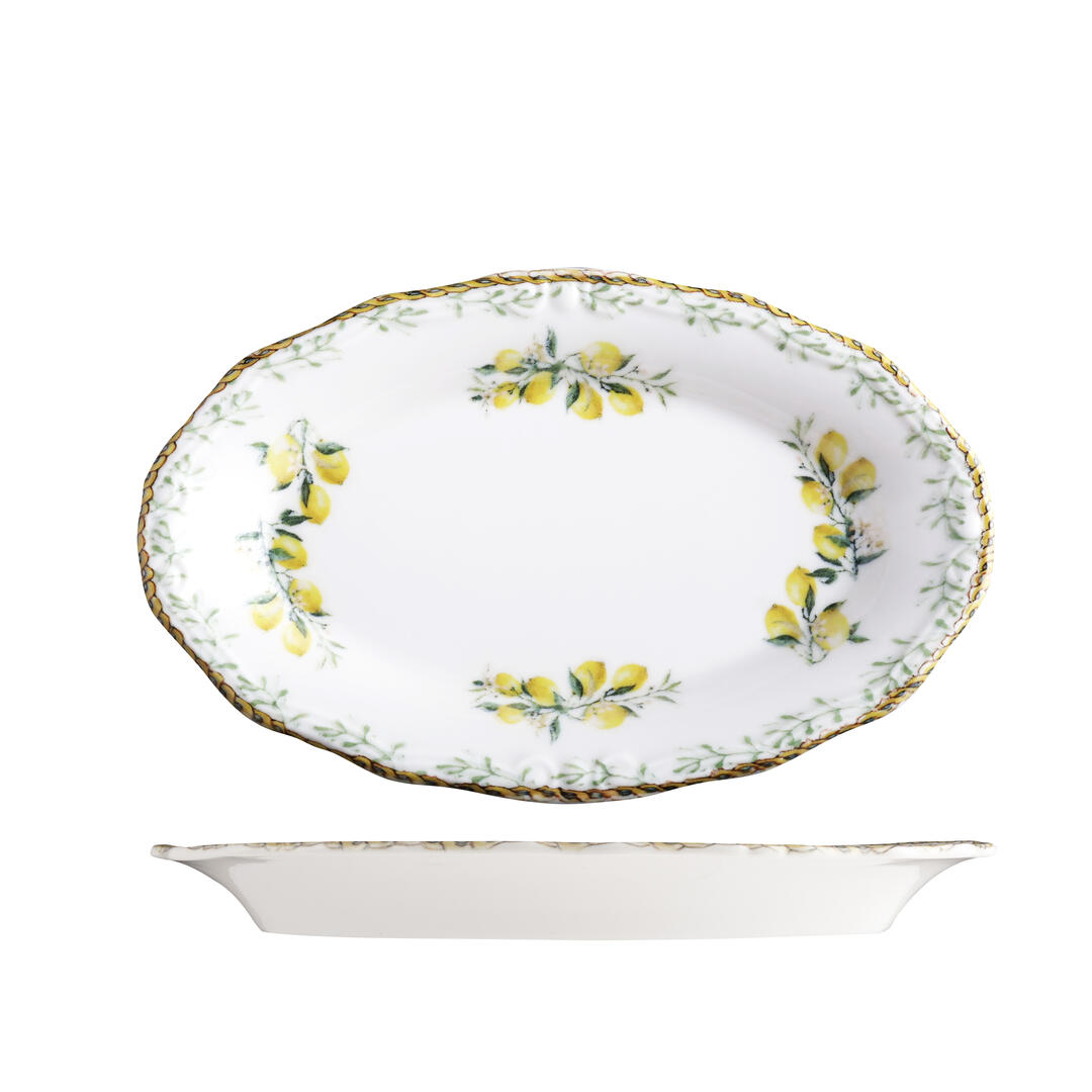 Capture the romance of northern Italy with the Verona range by ID Fine. A floral border of lemon blossoms and delicate foliage wraps around each piece, accented with soft botanical illustrations and applied using state-of-the-art digital printing to achieve layered depth and textural contrast. At the centre, a clean white porcelain base keeps presentation focused and refined — ideal for fresh, seasonal fare.