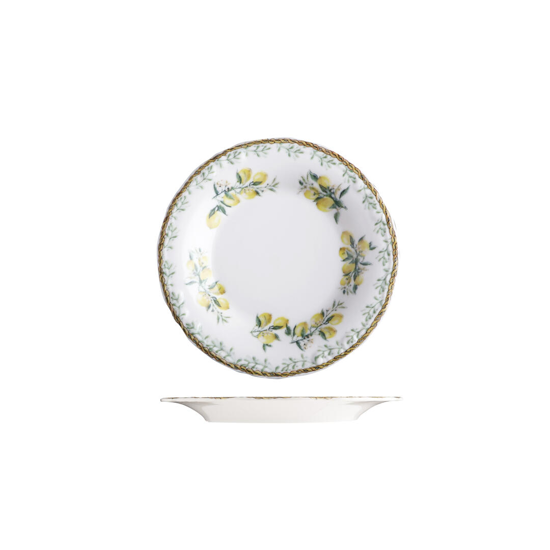 Capture the romance of northern Italy with the Verona range by ID Fine. A floral border of lemon blossoms and delicate foliage wraps around each piece, accented with soft botanical illustrations and applied using state-of-the-art digital printing to achieve layered depth and textural contrast. At the centre, a clean white porcelain base keeps presentation focused and refined — ideal for fresh, seasonal fare.