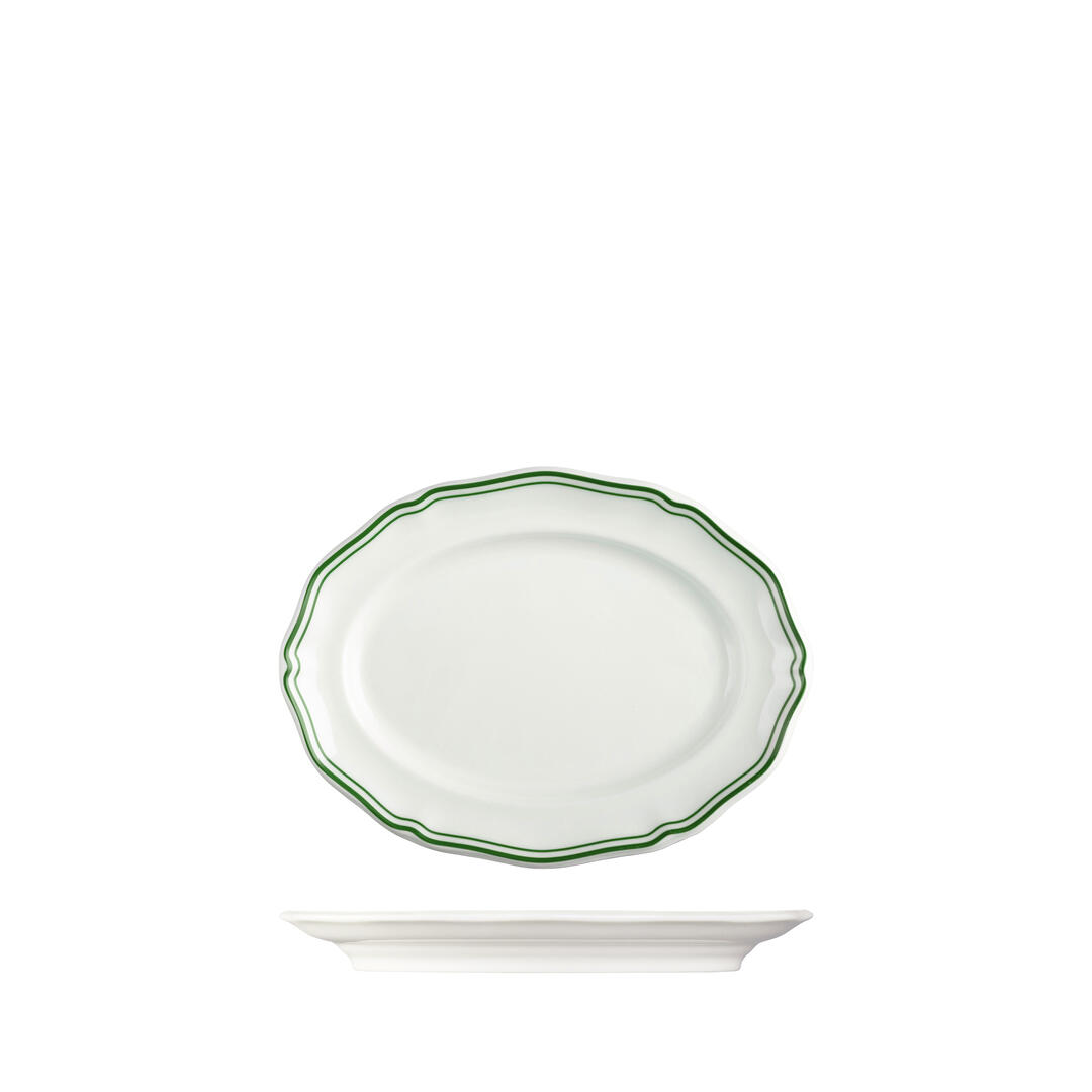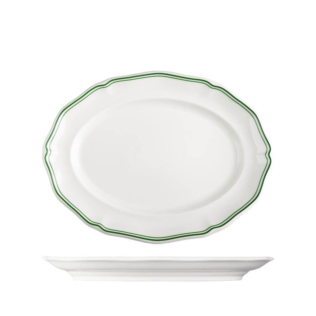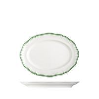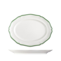 | 94357-GN | Oval Scalloped Wide Rim Plate | 300mm | 230mm | Emerald | Luzerne | New Bone | Dishwasher Safe, Microwave Safe, Oven Safe |