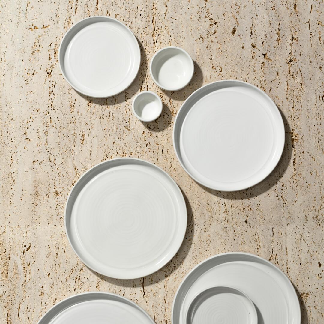 Discreet in form, precise in function, Butler by POTTR is designed to elevate food without ever competing with it. Crafted in a stark, hand-applied white glaze, the range features a sculpted inner rim that defines the plating area, gently carved from the clay itself. This subtle recess balances proportions, creating a frame around the edge that anchors sauces and elements to the centre of the dish.