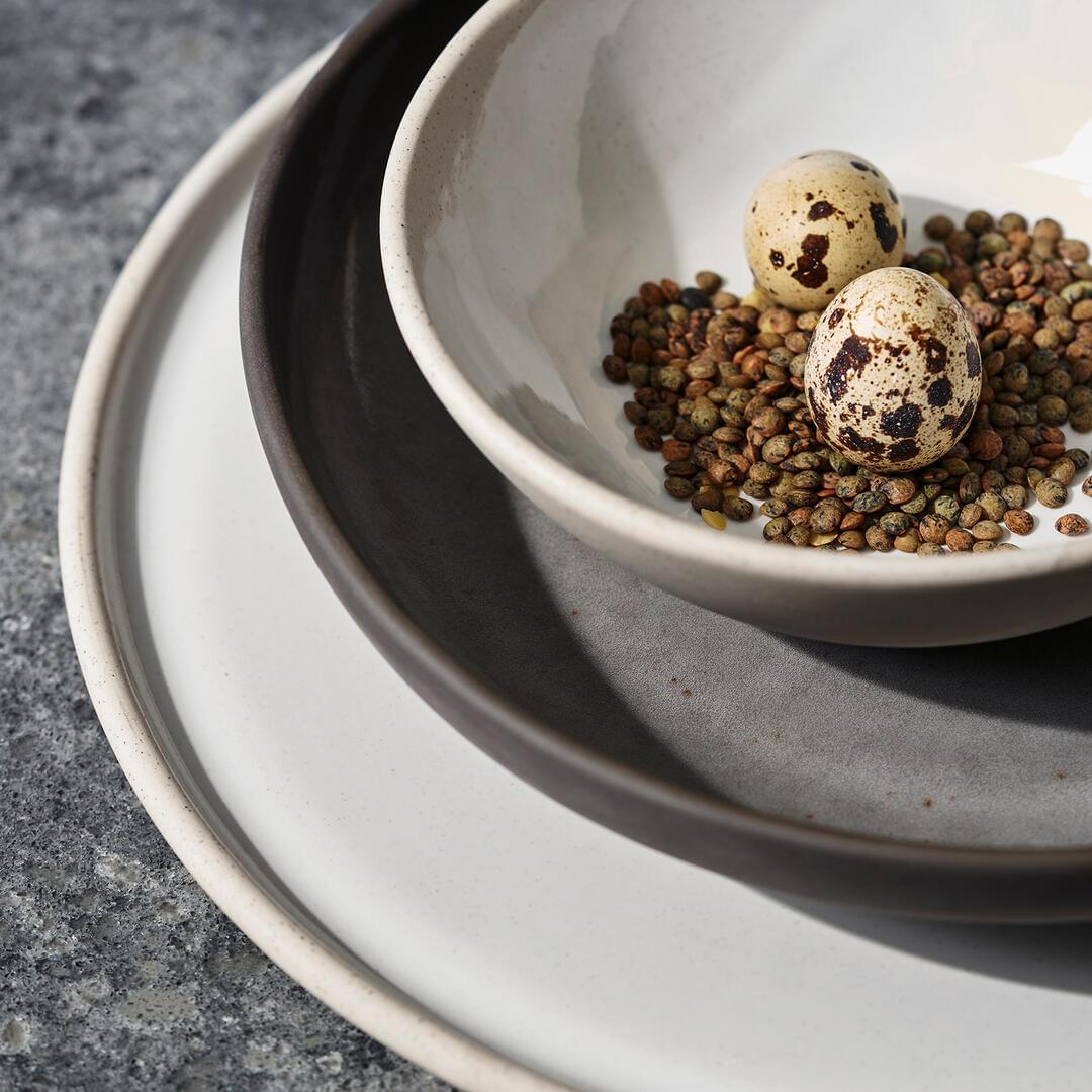 Gembrook embodies the organic nature of clay with its unique craftsmanship. A remarkable fusion of form & function, featuring a fully vitrified clay body and decorated with a reactive glaze. Each item is decorated with a sheer white, hand-applied glaze, allowing the beauty of the clay to show through. The bottom of each piece and small portions of the top are unglazed, to authenticate where the potter would hold each piece while glazing, resulting in double dips, drips, and exposed clay lending to its hand-thrown authenticity.