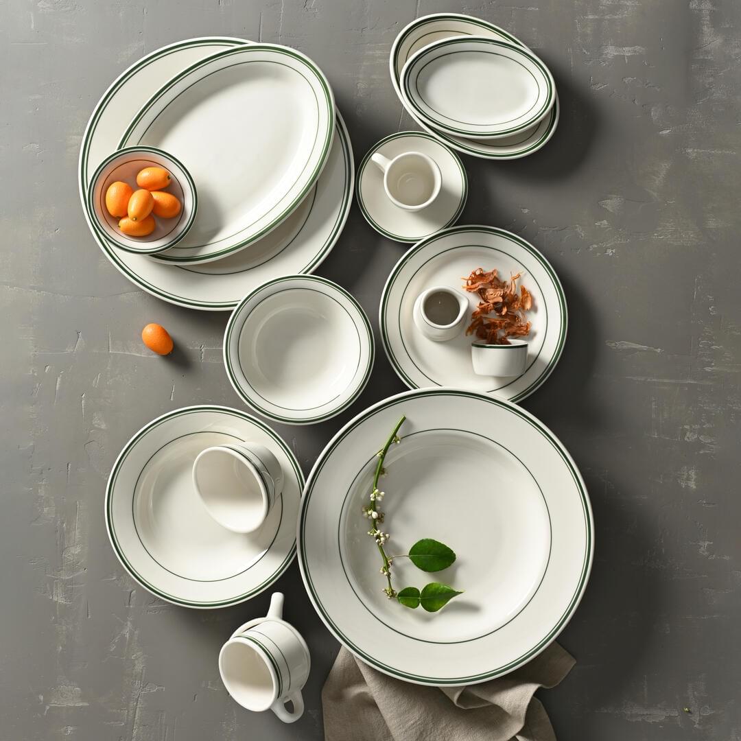 With its creamy white body and deep green banding, Green Bay is a vintage throwback with a modern approach. The double-line detail adds retro character, offering a sense of nostalgia to the dining experience. Green Bay is made from fully vitrified ceramic with enhanced chip resistance.
