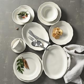 Shell brings a romantic softness to the table. A creamy white body, floral-inspired scalloped edges, and steep rims offer a delicate vintage aesthetic that feels right at home in today’s dining spaces. The considered range of plates, bowls, and beverage items offer a beautifully soft addition to the table, whether as a standalone range, or to mix-and-match with other service pieces for a curated look.